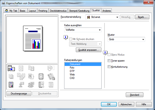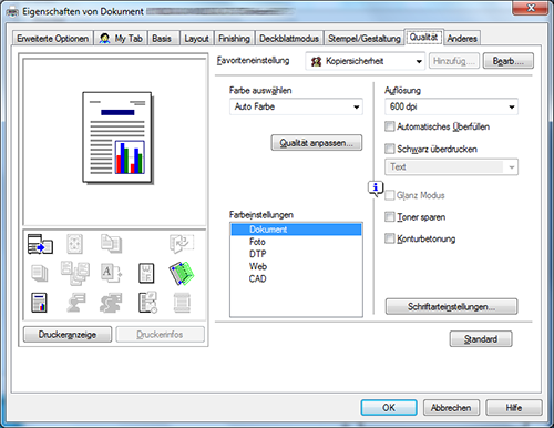 Auf der Registerkarte [Qualität] können Sie Einstellungen für die Bildqualität des Originals einrichten. Sie können die Farben angeben und die Art der Bild- und Schriftverarbeitung festlegen.
