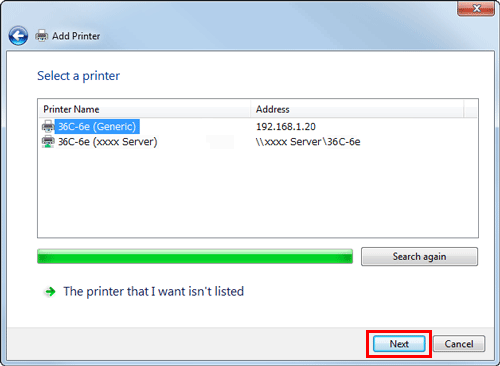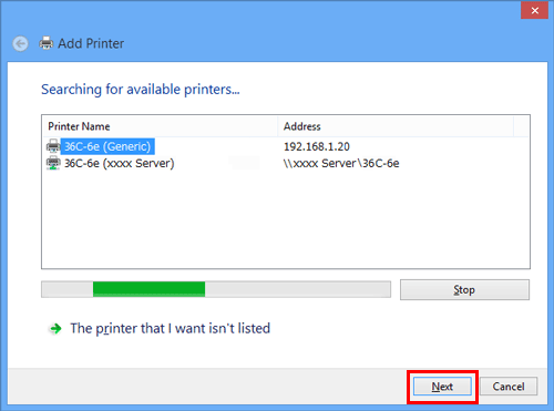 Klicken Sie in dem Fenster, in dem der erkannte Drucker angezeigt wird, auf [Der gesuchte Drucker ist nicht aufgeführt].