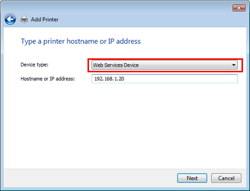 Wählen Sie [Webdienstegerät], geben Sie die IP-Adresse ein und klicken Sie dann auf [Weiter].