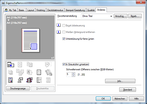 Aktivieren Sie auf der Registerkarte [Anderes] das Kontrollkästchen [In Graustufen umsetzen] und legen Sie den Schwellenwert (Unterschiede zwischen den RGB-Werten, bei denen eine Umwandlung in Graustufen erfolgt) fest.