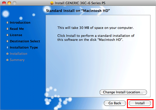 Klicken Sie auf [Continue] und folgen Sie den Anweisungen auf den anschließend angezeigten Seiten, bis die Seite [Install] angezeigt wird.