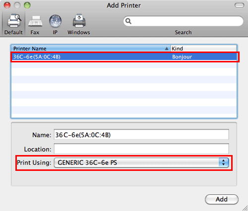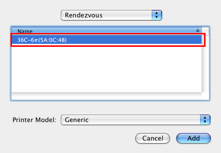 Fügen Sie den Drucker, der automatisch durch Rendezvous erkannt wurde, zum Computer hinzu.