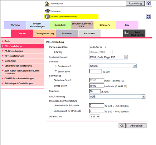 Wählen Sie im Administratormodus [Drucker] - [PCL-Einstellung] und richten Sie dann die folgenden Einstellungen ein.