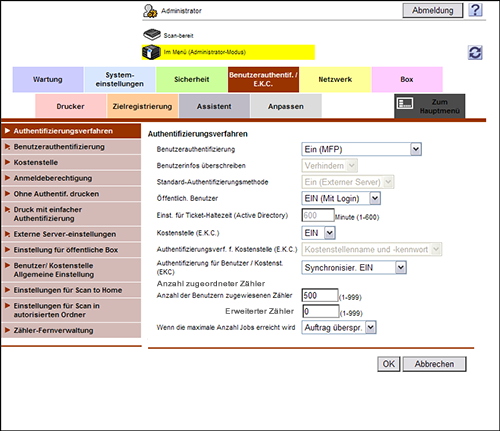 Die Kostenstellenfunktion ermöglicht die gemeinsame Verwaltung mehrerer Benutzer nach Kostenstellen. Informationen zur Kostenstellen-Authentifizierung werden intern von diesem System verwaltet.