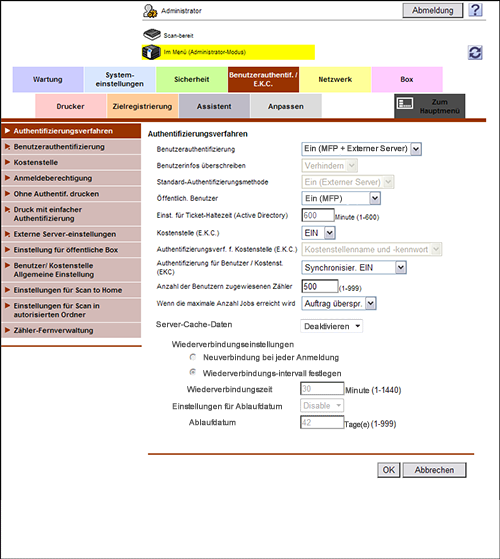 [Server-Cache-Daten] | Um Authentifizierungsinformationen temporär im Hauptsystem zu speichern, für den Fall, dass ein externer Authentifizierungsserver inaktiv wird, wählen Sie [Aktivieren] aus. [Deaktivieren] ist standardmäßig ausgewählt. |