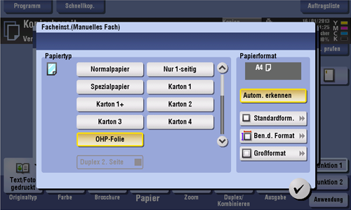 ] - [Facheinstellung ändern] - [Papiertyp] - [OHP-Folie] aus.