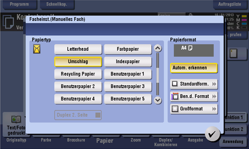 Bei Auswahl eines Papierformats, das in keines der Papierfächer eingelegt ist, bzw. zum Bedrucken von Umschlägen oder OHP-Folien verwenden Sie die Stapelanlage/den Spezialeinzug.