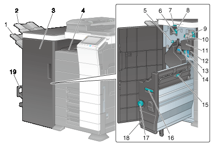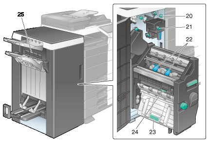 18 | Broschürenfinisher | Ziehen Sie diese Einheit zum Beheben eines Papierstaus oder Heftklammerstaus oder zum Austauschen eines Heftklammermagazins heraus. |