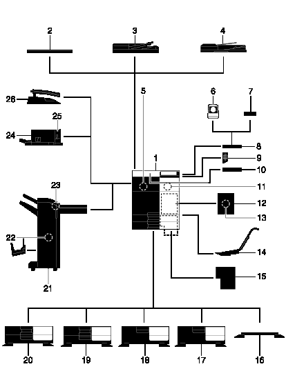 Die Abbildung zeigt die Haupteinheit mit dem Automatischen Duplex-Originaleinzug DF-624, der Papiereinzugseinheit PC-210, dem Fax-Kit FK-511, dem Fax-Kit FK-508, dem Fax-Montage-Kit MK-728 und der Stromversorgungsbox MK-734.