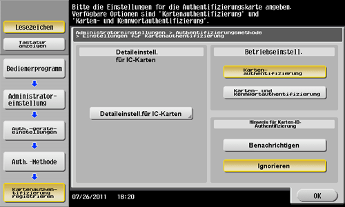 Tippen Sie auf [Auth.-geräteeinstellungen] - [Auth.-Methode] - [Kartenauthentifizierung] und