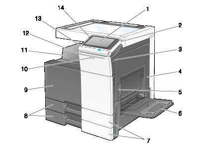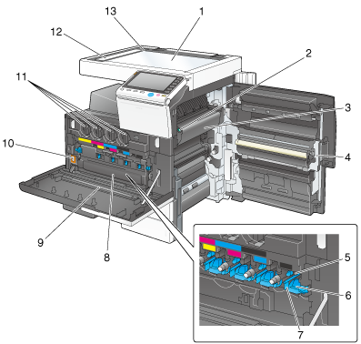 Diese Klappe wird geöffnet, um die Tonerkartusche, den Resttonerbehälter oder die Trommeleinheit auszutauschen und das Druckkopfglas zu reinigen. |