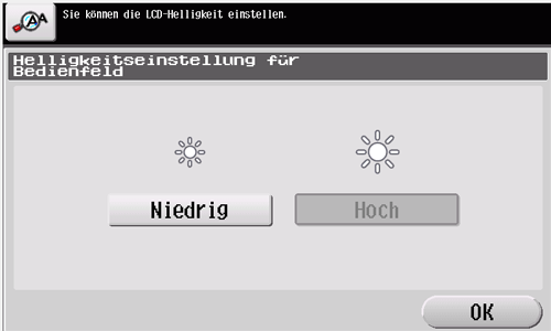 Tippen Sie auf [Voreinstellung] - [Helligkeitseinstellung für Bedienfeld] und wählen Sie [Niedrig] oder [Hoch] aus, um die Helligkeit einzustellen.