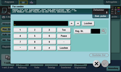 Geben Sie eine Zielfaxnummer ein, wenn gescannte Originaldaten per Fax gesendet werden. Tippen Sie bei der Verwendung von mehreren Zielen auf [Nächstes Ziel], um weitere Ziele hinzuzufügen.