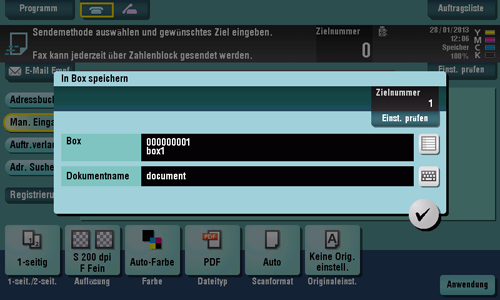 Wählen Sie eine Box aus, in der gescannte Originaldaten gespeichert werden sollen. Ändern Sie bei Bedarf den Dateinamen für die Speicherung.