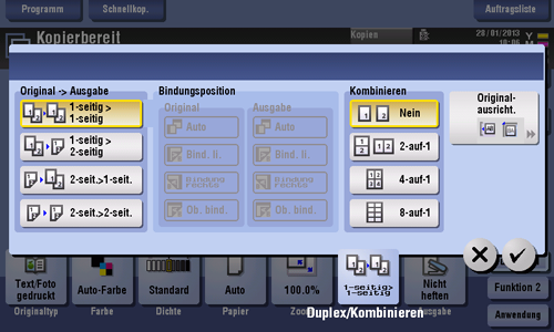 [Original > Ausgabe] | Wählen Sie eine Kombination des einzulegenden Originals (1-seitiges Original oder 2-seitiges Original) und die Kopiermethode (1-seitige Kopie oder 2-seitige Kopie). Ausführliche Informationen finden Sie Hier. |