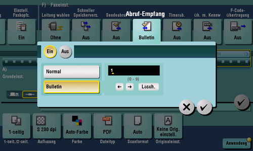[Bulletin] | Wählen Sie diese Option, um eine in einer Abrufbox gespeicherte Datei zu empfangen. Geben Sie die Boxnummer der Bulletin-Board-Box auf dem entsprechenden Zielsystem über die Tastatur ein. Tippen Sie zur Anzeige der Tastatur auf den Eingabebereich für Zahlen. |
