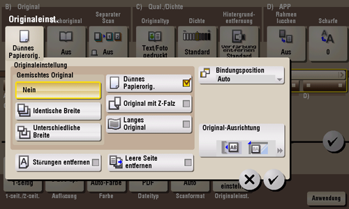 Diese Funktion verringert die Transportgeschwindigkeit des Originals im ADF, um beim Scannen eines Originals, das dünner als Normalpapier ist, einen Fehleinzug des Originals zu verhindern.