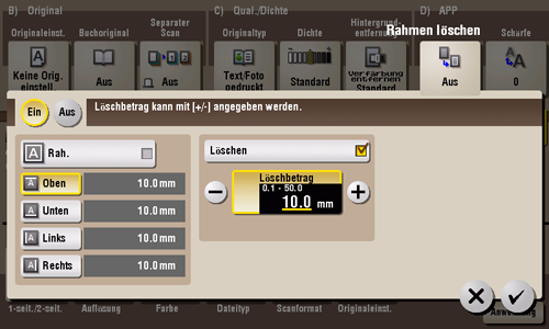 [Rah.] | Wählen Sie diese Option, um an den vier Seiten des Originals einen Randbereich mit identischer Breite zu löschen. Tippen Sie zur Angabe der Breite des zu löschenden Bereichs unter [Löschbetrag] auf [+]/[-] für einen Bereich in Zoll, tippen Sie auf [+]/[-] oder die Tastatur für einen Bereich in Zentimetern. Tippen Sie zur Anzeige der Tastatur auf den Eingabebereich für Zahlen. |