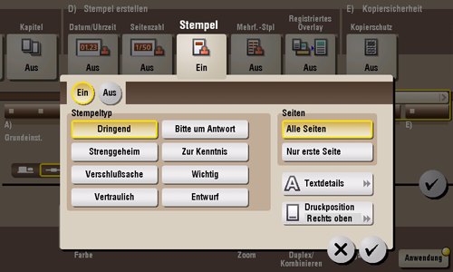 Text, wie z. B. "Bitte um Antwort" oder "Verschlusssache", kann auf der ersten Seite oder auf allen Seiten gedruckt werden. Sie können den zu druckenden Text aus den registrierten festen Stempeln und den eigenen registrierten Stempeln auswählen.