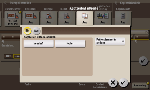 Wählen Sie [Ein] aus, um die Kopfzeile/Fußzeile zu drucken.