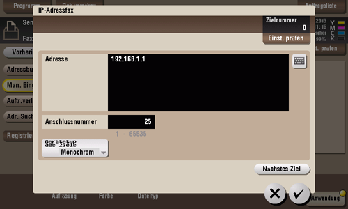 Geben Sie die IP-Adresse oder die E-Mail-Adresse ein, an die ein IP-Adressfax gesendet werden soll. Geben Sie an, ob das Empfängersystem Farbdruck unterstützt.