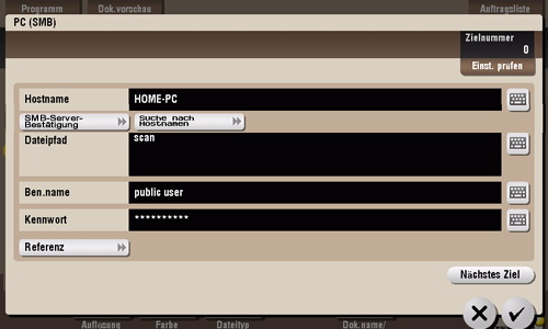 • Die Benutzerauthentifizierungsinformationen (Anmeldename und Kennwort) dieses Systems werden als Authentifizierungsinformationen für das SMB-Ziel (Hostname und Kennwort) verwendet.