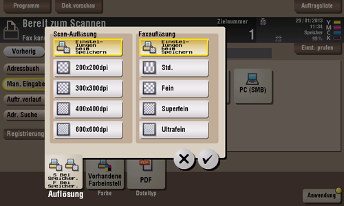 [Fax-Auflösung] | Wählen Sie die Auflösung des Originals für den Faxversand. Senden Sie bei der Verwendung der Funktionen Fax senden, Internet-Fax und IP-Adressfax das Original in der folgenden Auflösung.