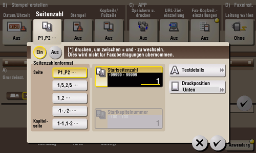 [Startseitenzahl] | Geben Sie über die Tastatur die Startseitenzahl an, die auf die erste Seite gedruckt werden soll. Tippen Sie zur Anzeige der Tastatur auf den Eingabebereich für Zahlen. Geben Sie zum Beispiel für den Druck von Seitenzahlen ab der dritten Seite der Datei "-1" ein. Die erste Seite der Datei wird als "-1", die zweite Seite als "0" und die dritte Seite als "1" gezählt. Unter [Startseitenzahl] wird festgelegt, dass eine Seitenzahl auf Seite 1 und auf den folgenden Seiten gedruckt wird. Wenn "2" eingegeben wird, werden die Seitenzahlen ab der ersten Seite der Datei in der Reihenfolge "2, 3" usw. gedruckt. "-" (Minuszeichen) wechselt bei jedem Tippen auf [*] zu +. |