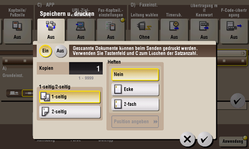 [Ein]/[Aus] | Wählen Sie [Ein] um gleichzeitig zu senden und zu drucken. |