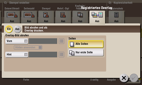 [Overlay-Bild abrufen] | Geben Sie an, auf welche Seite des Papiers das Overlay-Bild eingebettet werden soll, und wählen Sie das zu verwendende Overlay-Bild aus. Überprüfen Sie gegebenenfalls die Dichte, die Erstellungsmethode, die Farbänderung und die Vorschau des Overlay-Bilds. Bei Auswahl von [Hinten anwenden] wird das Bild der Vorderseite auf der Rückseite des Papiers erstellt. |