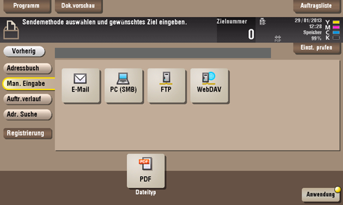 [PC (SMB)] | Geben Sie den Namen des Ziel-PCs (Hostname) oder die IP-Adresse für den Versand von Dateien zum freigegebenen Ordner des Netzwerk-PCs ein. |