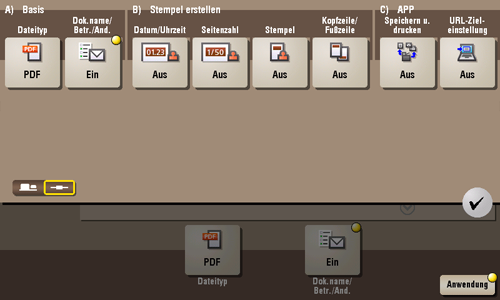 [APP] | Legen Sie Anwendungsoptionen für die E-Mail-Benachrichtigung beim Speichern von Dateidaten oder für die Änderung der Fax-Absenderinformationen usw. fest. |
