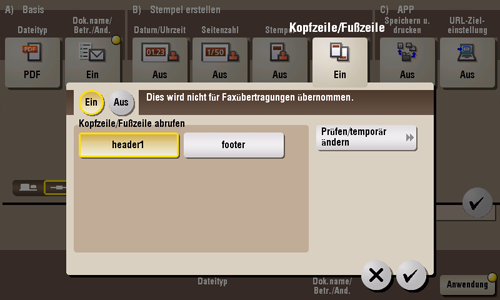 [Prüfen/temporär ändern] | Bei Bedarf können Sie die Details des Programms, das unter [Kopfzeile/Fußzeile abrufen] ausgewählt ist, prüfen oder vorübergehend ändern.