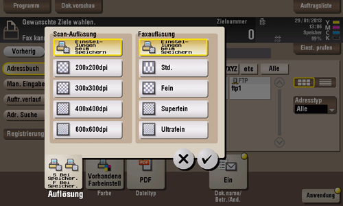 Wählen Sie eine Auflösung für die Dokumentdatei, wenn diese auf einem externen Speicher abgelegt wird.