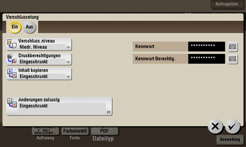 [Kennwort] | Geben Sie ein Kennwort ein, um den Zugriff auf die Datei zu beschränken. Erstellen Sie eine PDF-Datei, auf die bestimmte Benutzer zugreifen können, denen das Kennwort bekannt ist. |