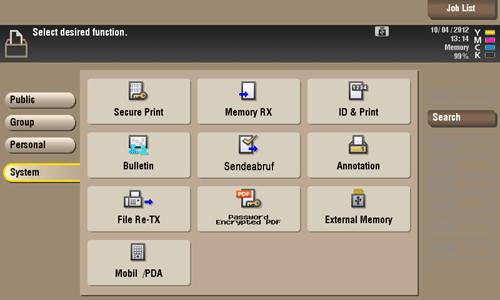 Wenn Sie ein Dokument über einen PC drucken oder die Funktion "Geschützter Druckauftrag" im Druckertreiber auswählen, werden diese Daten in der Box für geschützte Druckaufträge gespeichert. Nachdem Sie die Box geöffnet haben, können Sie eine in der Box gespeicherte Datei auswählen und diese anzeigen, drucken, umbenennen oder löschen. Für den Druck von Dateien, die in der Box für geschützte Druckaufträge gespeichert sind, werden die Dokumenten-ID und das Passwort benötigt. Nach dem Druck wird die Datei automatisch gelöscht. Diese Box wird für vertrauliche Dokumente verwendet. |