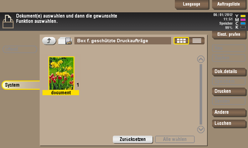 Wenn Sie ein Dokument über einen PC drucken oder die Funktion "Geschützter Druckauftrag" im Druckertreiber auswählen, werden diese Daten in der Box für geschützte Druckaufträge gespeichert. Nachdem Sie die Box geöffnet haben, können Sie eine in der Box gespeicherte Datei auswählen und diese anzeigen, drucken, umbenennen oder löschen.