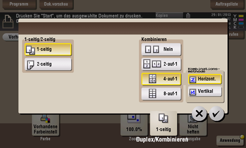 Bei Auswahl von [4-auf-1] oder [8-auf-1] können Sie das kombinierte Seitenlayout auf [Horizont.] oder [Vertikal] setzen.