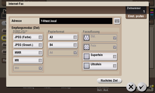 Geben Sie die Ziel-E-Mail-Adresse ein, an die ein Internet-Fax gesendet werden soll. Wählen Sie außerdem aus, welche Art von Dokumentdaten das Empfängersystem empfangen kann.