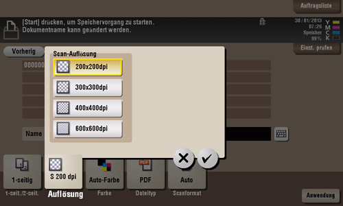 [Scan-Auflösung] | Wählen Sie die Auflösung des Originals, das in der Box gespeichert werden soll. [600 600 dpi]: Wählen Sie diese Option, um ein Original in eine Datei mit maximaler Größe umzuwandeln. Wählen Sie diese Option zum Scannen eines Originals mit hoher Bildqualität, z. B. Vollfarbenfoto.