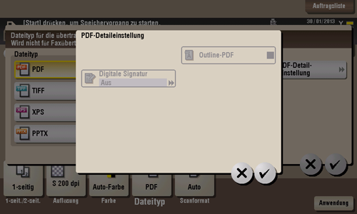 [Digitale Signatur] | Wählen Sie [Ein] aus, um eine digitale Signatur (Zertifikat) dieses Systems zu einer PDF-Datei hinzuzufügen, und wählen Sie [SHA1] oder [SHA256] als Verschlüsselungsstärke der Signatur aus. Sie können den Autor einer PDF zertifizieren und Fälschungen und unautorisierte Änderungen verhindern. Diese Funktion ist aktiviert, wenn ein Zertifikat auf diesem System registriert ist. |