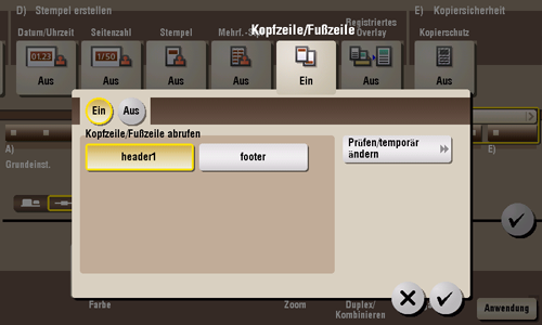 [Prüfen/temporär ändern] | Bei Bedarf können Sie die Details des Programms, das unter [Kopfzeile/Fußzeile abrufen] ausgewählt ist, prüfen oder vorübergehend ändern.