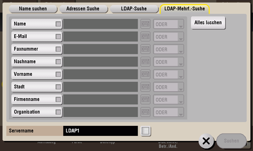 Wenn der LDAP-Server oder Active Directory von Windows Server verwendet wird, geben Sie eine Kombination aus Schlüsselwörtern aus verschiedenen Kategorien für die Suche nach einer E-Mail-Adresse oder Faxnummer ein.
