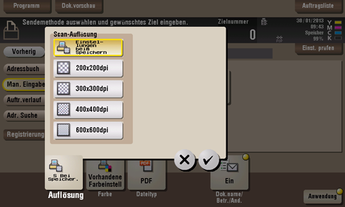 [Scan-Suflösung] | Wählen Sie die Auflösung für das Scannen und Senden des Originals. Zur Verwendung der Funktionen E-Mail-Versand, SMB-Übertragung, FTP-Übertragung und WebDAV-Übertragung wird die folgende Auflösung für den Versand ausgewählt.