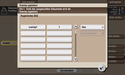 Speichern Sie eine Datei als Overlay-Bild. Nach der Registrierung können Sie während des Kopierens oder Druckens ein Overlay-Bild auf dem Original erstellen.