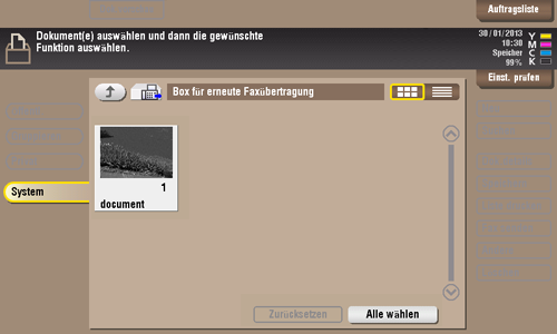Wenn das Empfängersystem belegt ist und keine Verbindung hergestellt werden kann, werden unzustellbare Faxdokumente in der Box für die erneute Faxübertragung abgelegt. Nachdem Sie die Box geöffnet haben, können Sie ein in der Box gespeichertes Faxdokument auswählen und dieses anzeigen, ausdrucken, senden oder löschen.