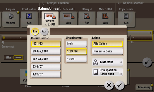 Sie können eine Druckposition und das Format auswählen und das Datum und die Uhrzeit einfügen. Datum und Uhrzeit können entweder auf allen Seiten oder nur auf der ersten Seite gedruckt werden.