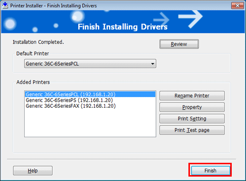 If necessary, change the printer name or print a test page, and click [Finish].