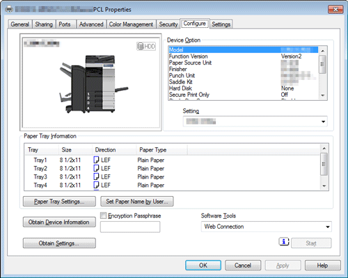 [Obtain Device Information] | The PC communicates with this machine and obtains the optional device installation information. In [Obtain Settings...], set the method of obtaining the information on this machine. | |