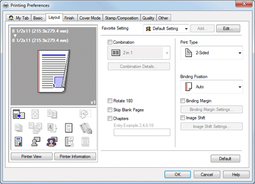 In the [Layout] tab, you can configure layout settings for printing. You can combine pages or adjust print positions.